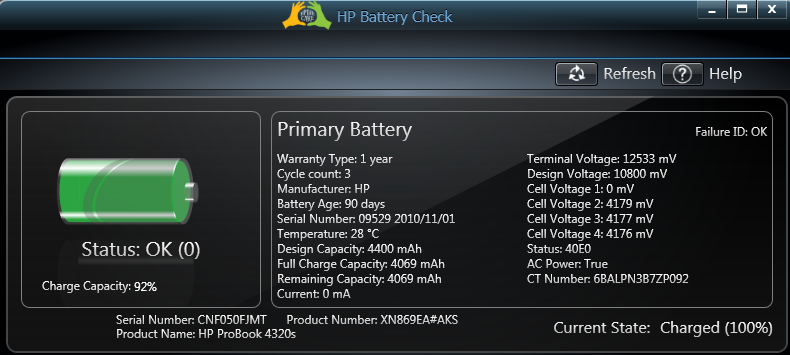 V prípade notebookov HP je možné použiť program HP Battery Check, ktorý zobrazí podrobné informácie o batérii, jednotlivých bunkách, počte nabíjacích cyklov, dátume výroby a podobne. Program takisto, v prípade potreby, odporučí výmenu batérie.